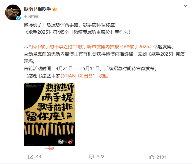 作为湖南卫视的王牌音综,《歌手2025》将于2025年第二季度在湖南卫视与芒果TV同步播出。这档节目延续了前作“直播真唱不修音”的高标准,同时以更豪华的阵容、更国际化的视野和创新赛制,成为年度最受期待的音乐盛宴之一。